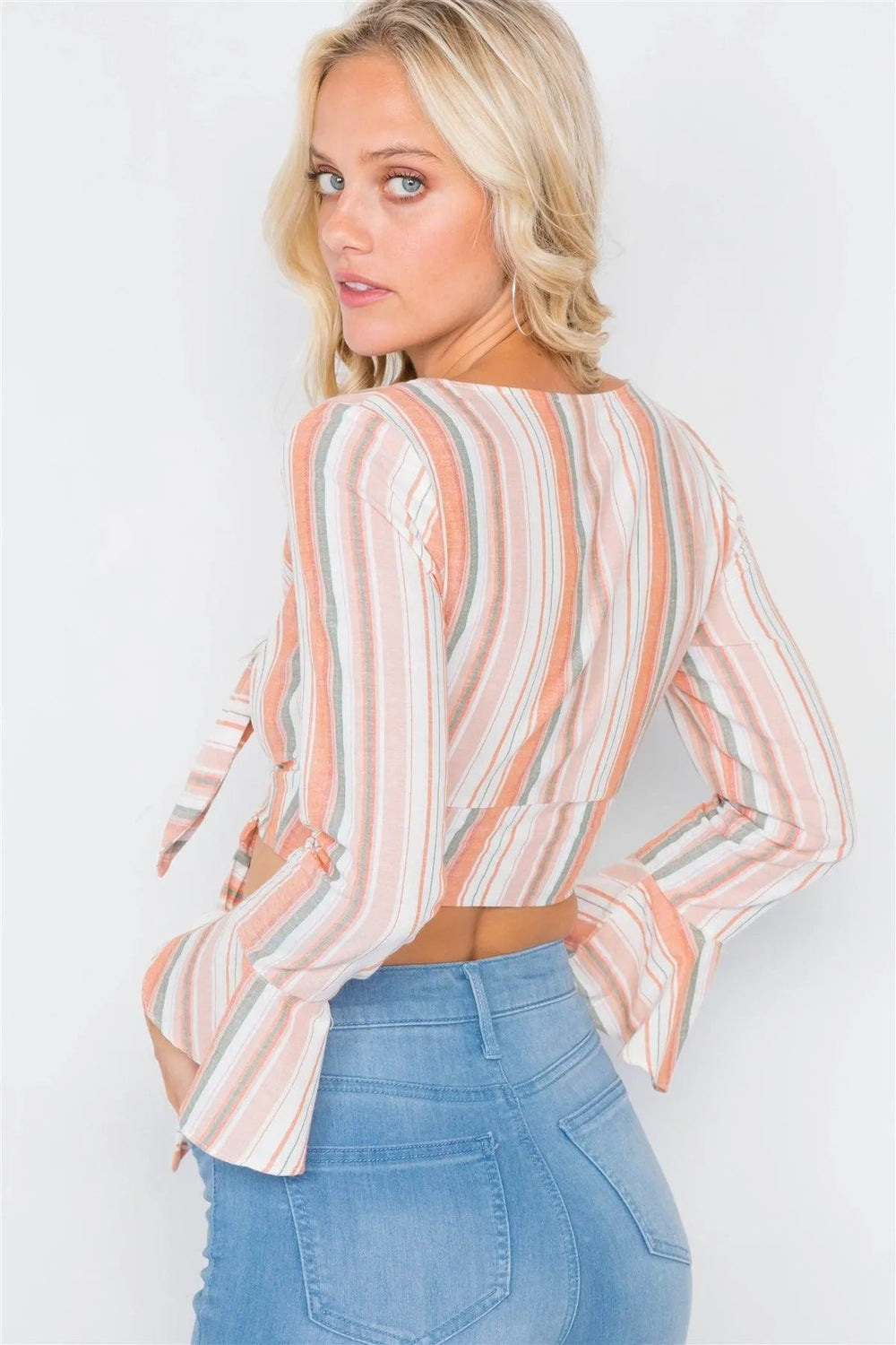 Top features: two front tie closure, crop length, full sleeve with flounce cuff, green white pink and peach multi stripes, surplus v-neck, unlined, some stretch.Model is 5'8 and wearing a Small ( Bust: 32B", Waist: 25", Hips: 35.5") Item Measurements: Length: 13.5", Bust: 33" Sleeve 20.5"True to size